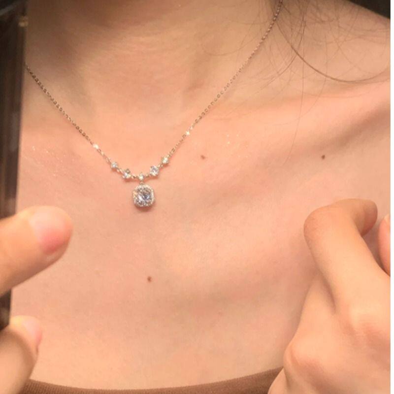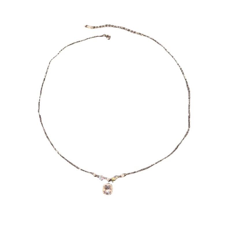 胸元を華やかに彩るレディースネックレスです。 中央には存在感のある円形のモチーフを配し、その上部には小粒のビジューを繊細に連ねたデザインが特徴です。 シルバーの上品な輝きが、どんなシーンにもマッチします。 繊細なチェーンと煌めく装飾が、エレガントで洗練された印象を演出します。 結婚式やパーティーなどの華やかな場面から、日常使いまで幅広くお使いいただけます。 女性らしさを引き立てる、特別な一品です。