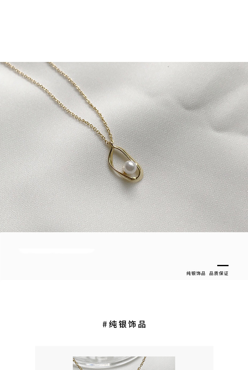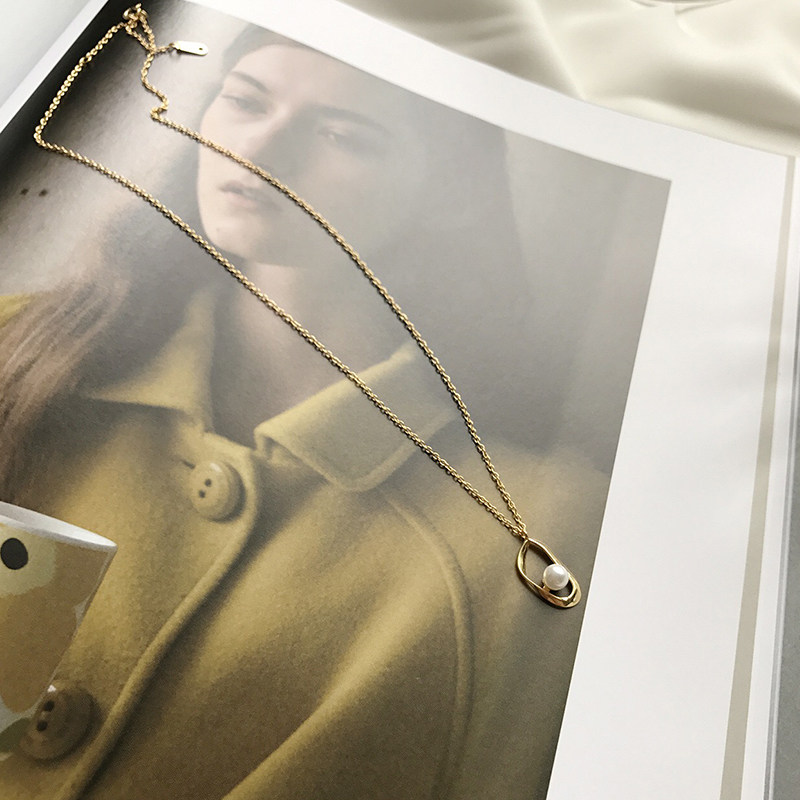 華奢な楕円形のメタルフレームに一粒のパールを抱き込んだ上品なデザインのレディースネックレスです。