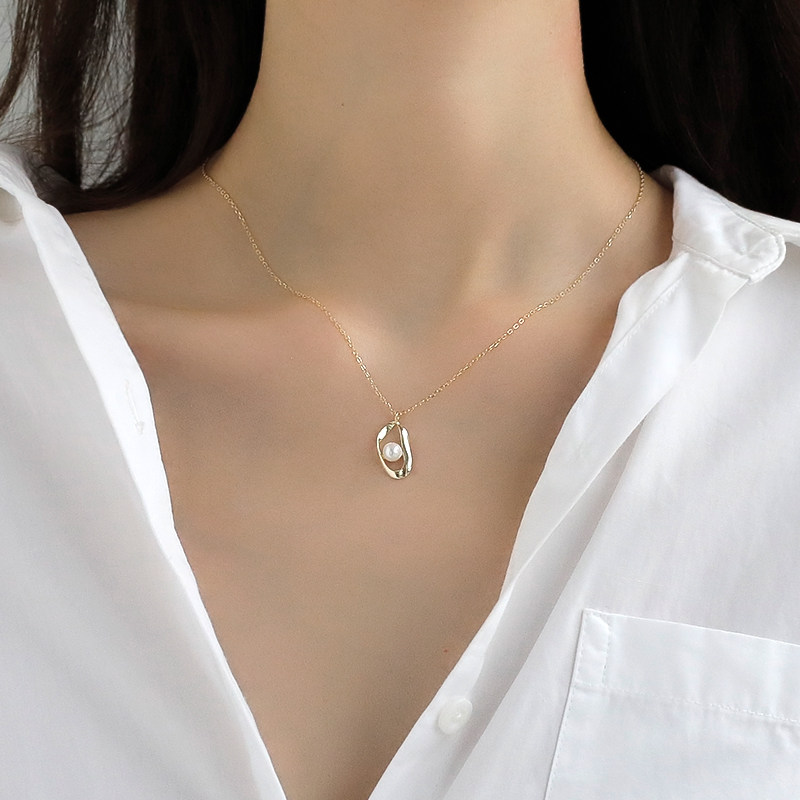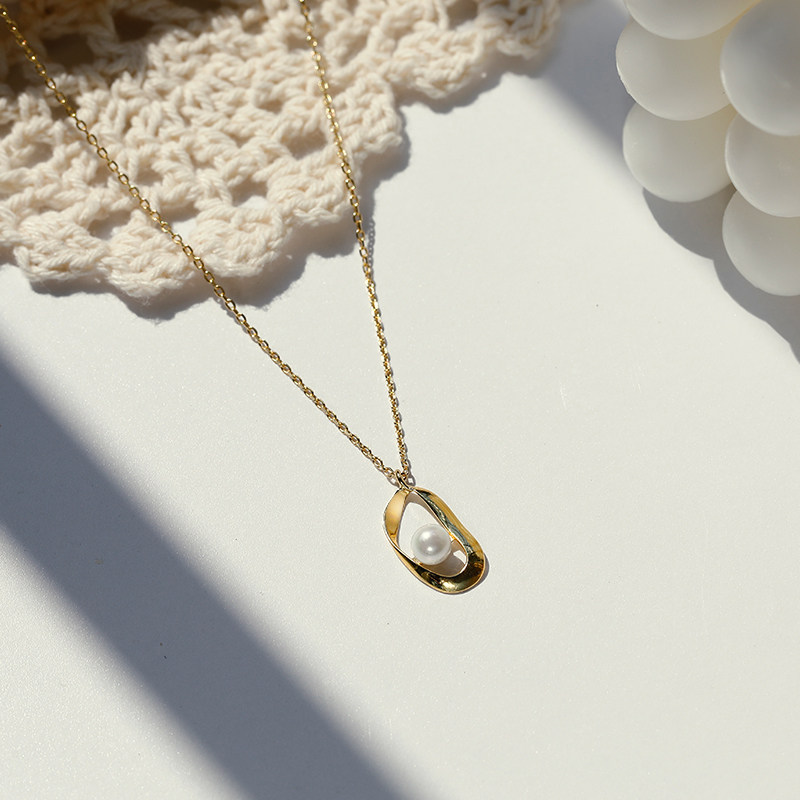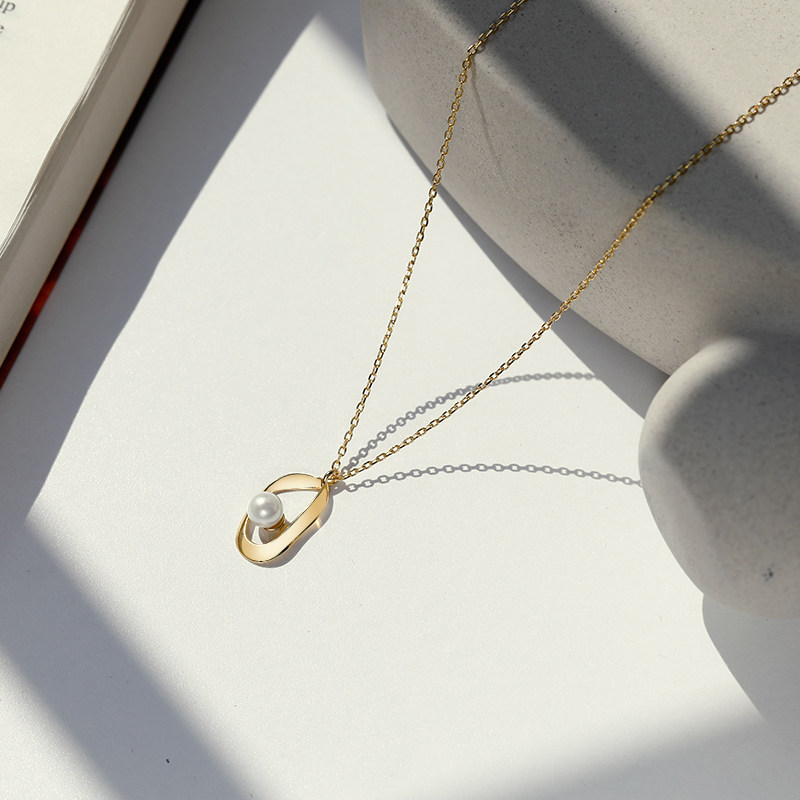 華奢な楕円形のメタルフレームに一粒のパールを抱き込んだ上品なデザインのレディースネックレスです。 立体的な楕円モチーフが胸元で優雅に揺れ、洗練された雰囲気を演出します。 シンプルながらも存在感があり、日常使いから特別な日まで幅広くお使いいただけます。 繊細なチェーンとパールの輝きが調和し、大人の女性らしさを引き立てる一品です。