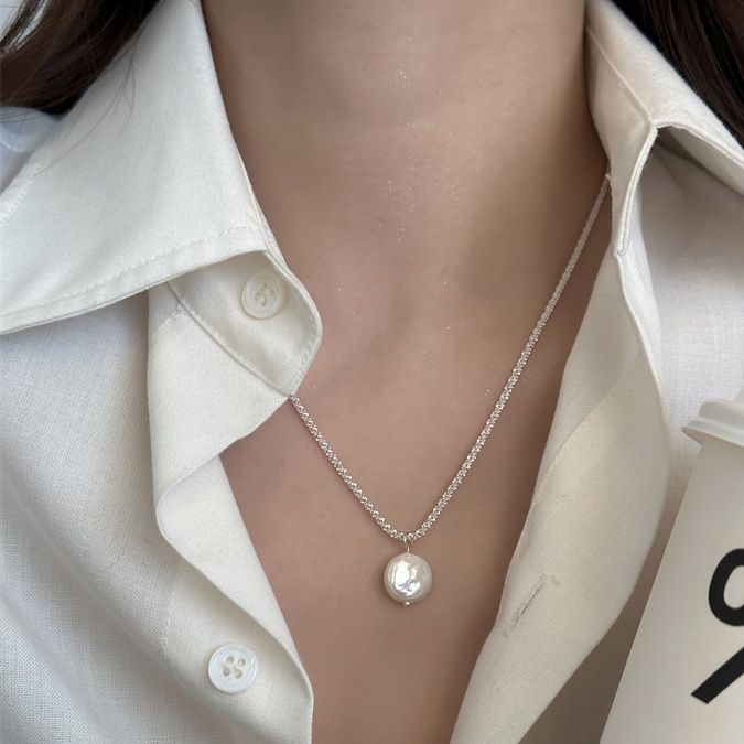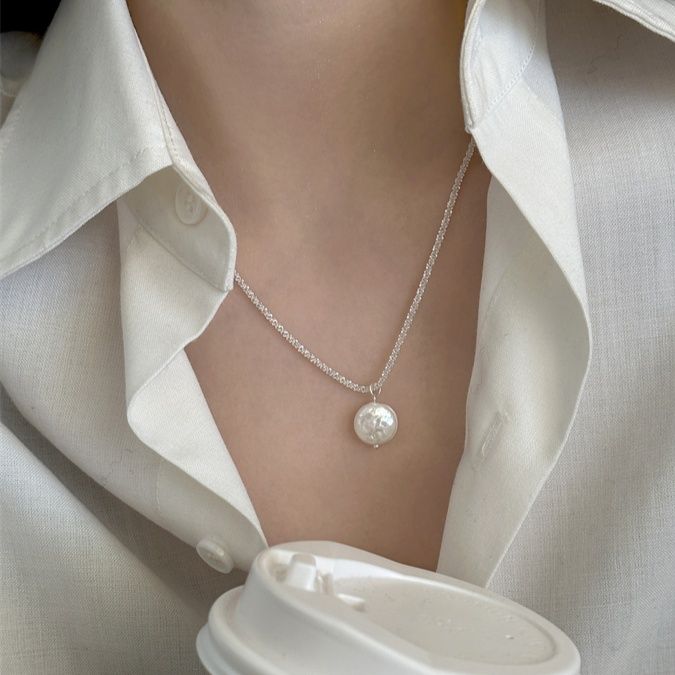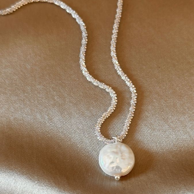 艶やかな淡水パールが胸元で優雅に揺れ、シルバーのきらめく細身のチェーンが首元を繊細に彩ります。